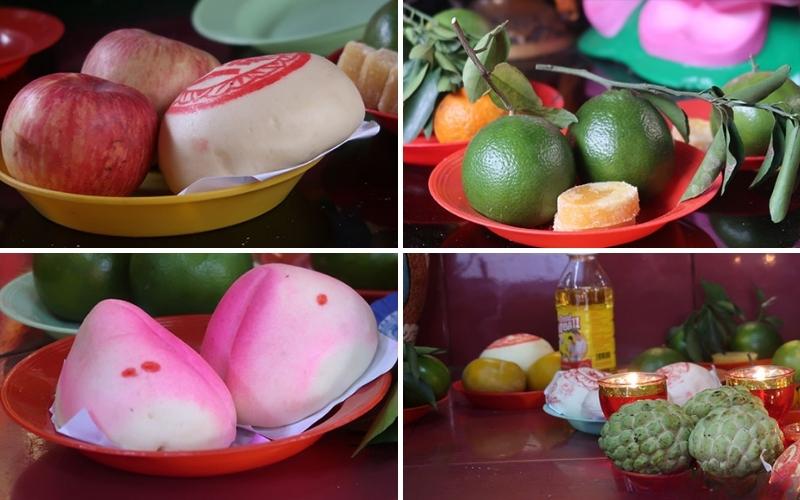 Offrandes à la Pagode Quan Am comprenant des fruits, des baozi, de l’huile de cuisine