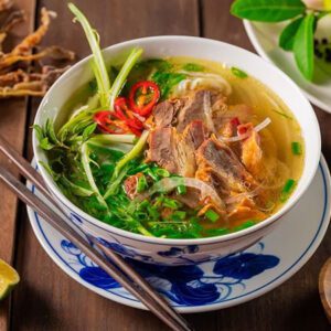 Ce nom légendaire évoque sans aucun doute le plat le plus populaire du Vietnam. Le Pho se consomme toujours chaud et à tout moment de la journée, notamment au petit-déjeuner. Viande (bœuf ou poulet) et nouilles accompagnées d’herbes aromatiques et d’oignons nouveaux, le tout s’harmonise dans un bouillon fait d’os de bœuf. Cuisiné pendant des heures, le bouillon, dans certaines recettes, est additionné d’anis étoilé et de cannelle pour obtenir plus de saveurs. À un prix très abordable, vous pouvez déguster un bol de pho aussi réconfortant que savoureux partout dans les restaurants d’Hanoï. Essayez aussi de manger dans une petite restauration de rue comme un Vietnamien car cela expliquera pourquoi ses adeptes, de tous âges et de tous goûts, salariés et étudiants, ne s’en lassent pas en semaine.