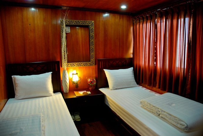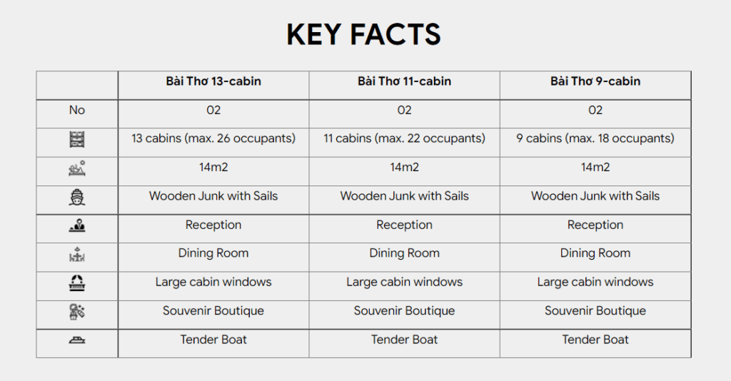 Bai Tho Junk Halong offre aux voyageurs la flexibilité d’une croisière d’une journée ou d’une nuit. Étant une jonque en bois avec des détails vietnamiens traditionnels, la croisière Bài Thơ convient parfaitement aux clients qui souhaitent avoir la possibilité de s’immerger dans les paysages spectaculaires de la baie d’Ha Long, mais qui voyagent avec un budget relativement réduit. Les offres à bord proposent un hébergement de croisière de base avec des cabines climatisées, des salles de bains privatives, une terrasse, un restaurant et un bar.